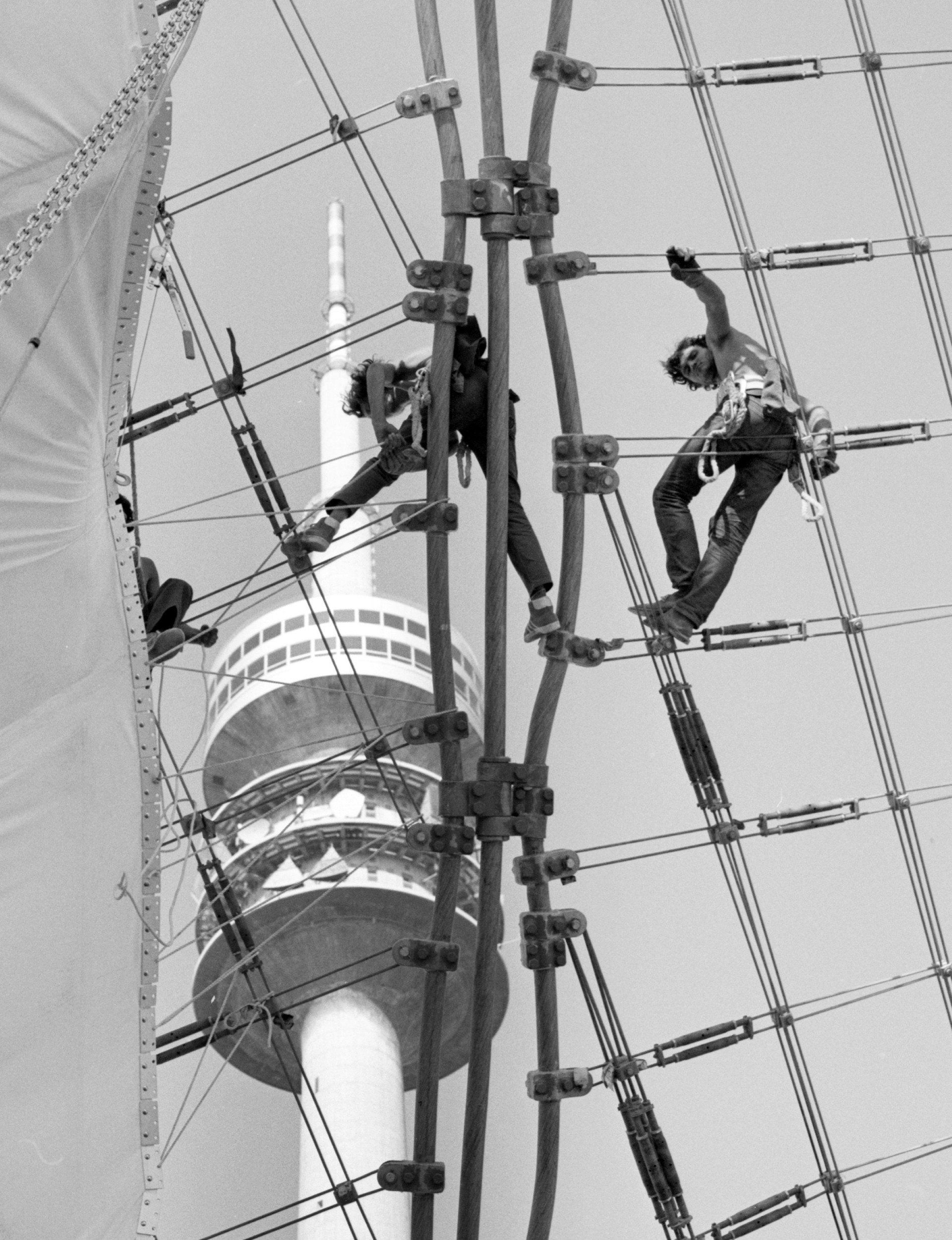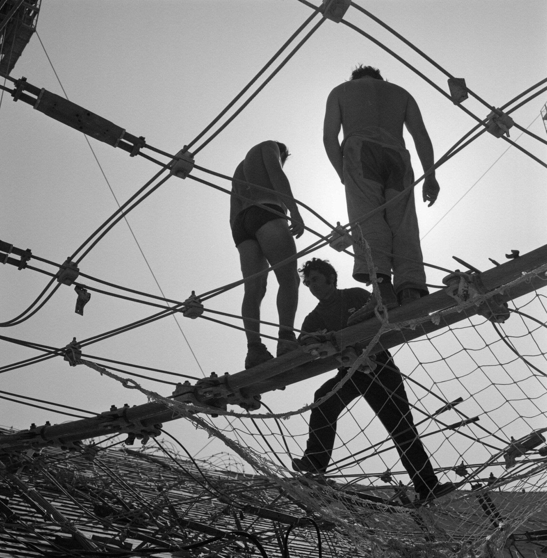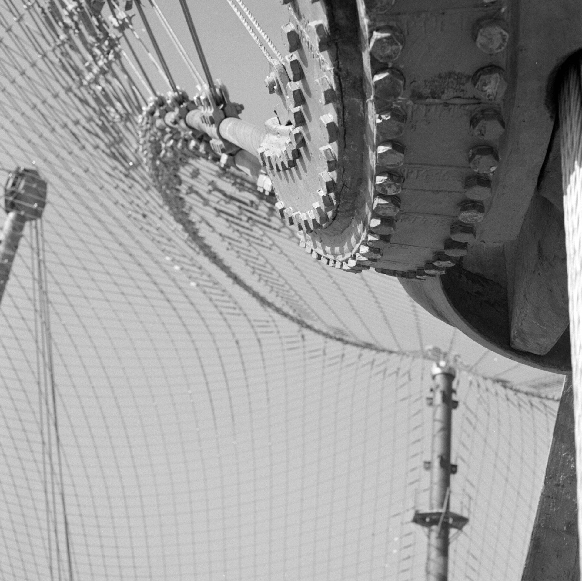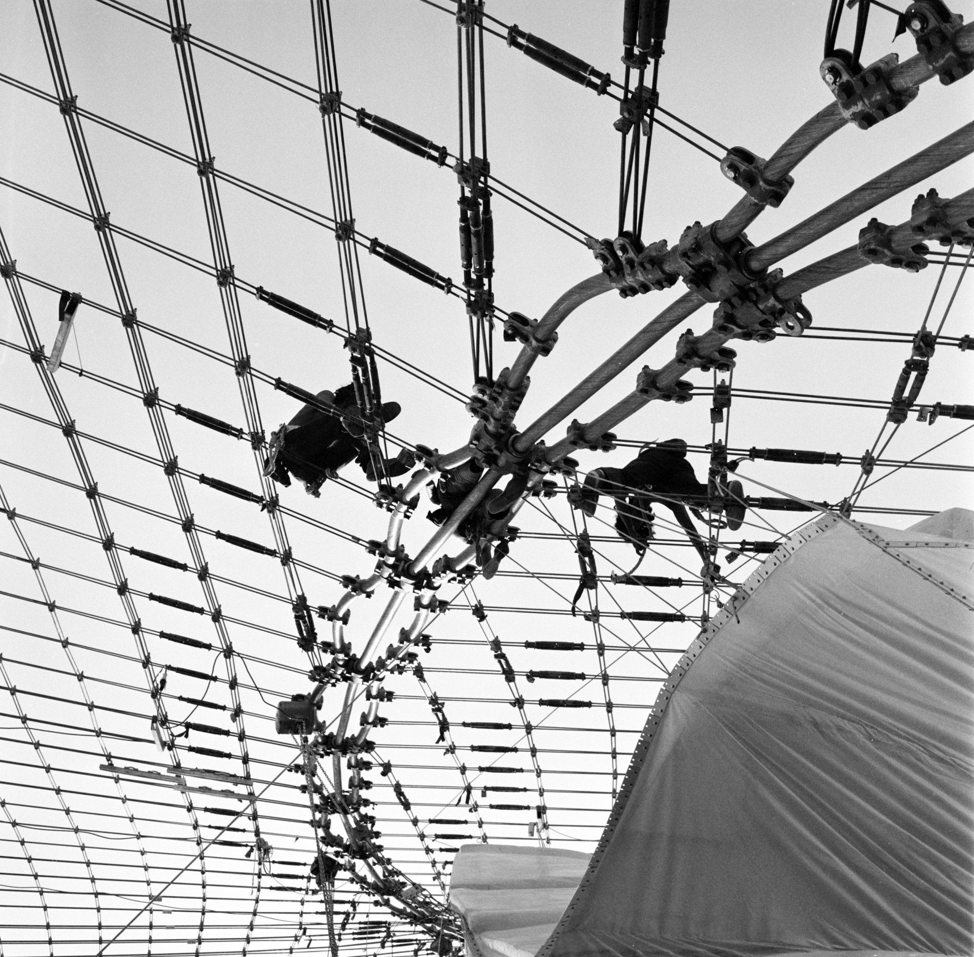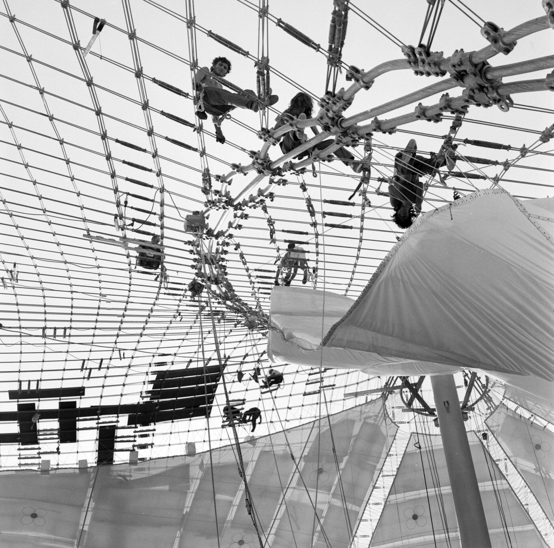 Das Olympiastadion in München wurde nach den Plänen des Architekturbüros Behnisch und Partner unter Mitwirkung des Architekten Frei Otto errichtet. Letzterer hatte auf der Weltausstellung in Montreal eine Zeltdachkonstruktion realisiert, die an ein Zirkuszelt denken lies. Auf der Basis dieser Idee wurde das MünchenerOlympiastadion errichtet. Diese Konstruktion hat mich derartig fasziniert, dass ich mir mit Hilfe der SZ eine Zugangserlaubnis beschaffte. Diese Fotos wurden im August 1971 aufgenommen